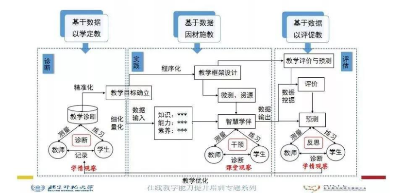 基于这种教学模式一般来说包括三个主要的环节,一个是基于数据,以学定教。第二步是基于数据的因材施教。第三是要基于数据,以评促教。