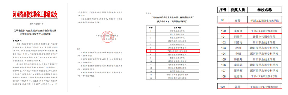 12月20日,河南省高校实验室工作研究会发布了《关于表彰河南省高校实验室安全知识大赛优秀组织奖和优秀个人的通知》(豫高实[2022]7号),我校荣获“河南省高校实验室安全知识大赛优秀组织奖”,计算机网络技术专业高贵等4名同学荣获“河南省高校实验室安全知识大赛个人优秀奖”