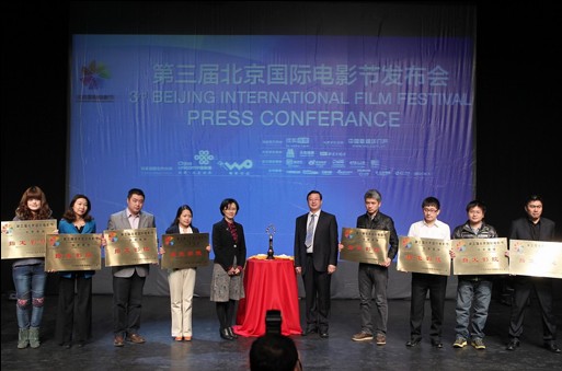 3月21日,第3届北京国际电影节发布了主竞赛单元“天坛奖”奖杯、电影节海报,并介绍了今年电影节嘉年华活动的概况,同时为第三届北京国际电影节26家指定展映影院举行授牌仪式。国家新闻出版广电总局电影局副巡视员栾国志、北京市委宣传部副部长张淼、北京市广播电影电视局局长李春良、北京市政府新闻办公室主任王惠、北京市广电局副巡视员赵志勇等领导出席了发布会。