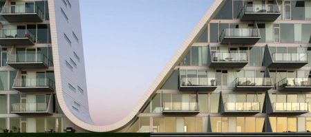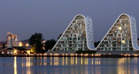 一家丹麦的设计公司设计了这座坐落在海边形如波浪的建筑,并由此获得了今年的LEAF建筑设计奖。这座建筑的设计灵感来自于瓦埃勒市的风貌——大桥、港湾、山峦都给了它设计的火花,它将成为该市的地标性建筑。预计这座建筑中将容纳140套双层结构的套房,每一套视野都很开阔。白天,这座“白色波浪”倒映在海水里与海湾相映成趣,夜晚,它则如同多彩的山峦一般与周围的景色融为一体。