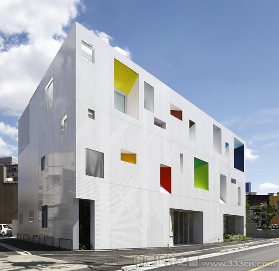 就是其中一个很突出的例子。如果咬人们选择与银行类建筑相关在金融银行类建筑立面,通过清新的色彩和明亮的光线传递给客户们轻松愉快的心情的建筑还为数不多,东京巢鸭信用银行的颜色,80%-90%的人会选择灰色,显得沉稳,庄重,这是这个行业惯有的思考方式趋势所要求的特点。这使得emmanuelle moureaux工作室设计的这座东京巢鸭信用银行建筑出类拔萃,别具一格,一扫银行业建筑灰色阴霾。建筑体周身随意切开的大大小小的窗户跟切面,涂抹上不同的颜色,可以随阳光照射角度的不同而闪耀不同的色彩。