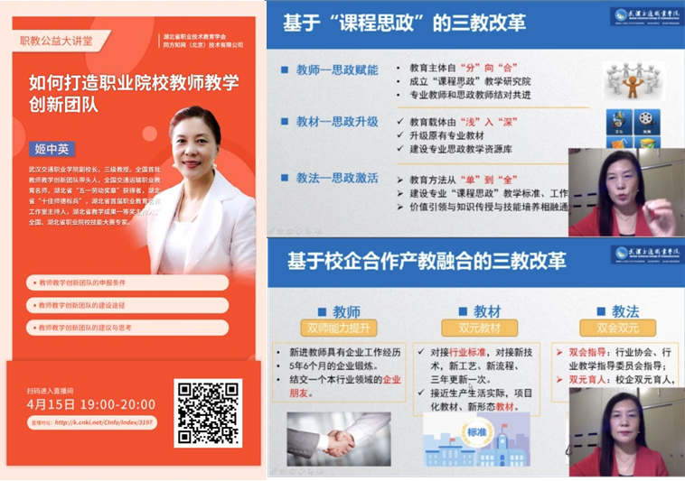 4月15日晚,自动化与信息工程学院利用职教公益大讲堂平台,共同学习武汉交通职业学院副校长姬中英教授题为“如何打造职业院校教师教学创新团队”的在线直播讲座,并围绕师德师风建设、课程思政、校企合作、产教融合等方面开展线上教研活动。