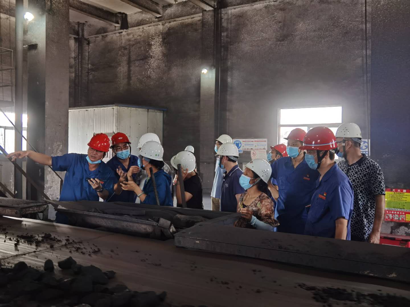 教师团队在安全人员的要求指导下,佩戴安全帽,在主管技术人员的陪同下,分别对原煤仓储运配煤、原煤分级除杂破碎脱泥、无压三产品重介质旋流器分选工艺、TBS分选工艺、浮选工艺、主洗车间现场集控系统进行现场交流学习。