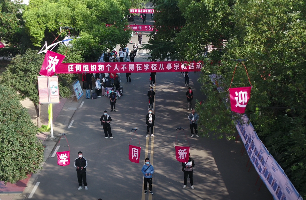 在升旗广场有10多架固定翼及多旋翼无人机向新同学展示,使他们了解无人机的发展与应用;学海英姿广场上空,一架植保无人机携带“热烈欢迎2021级新同学”的标语迎风飞扬;7架小型无人机依次排开带着“热烈欢迎新同学”的标语嗡嗡飞行;最引人瞩目的是大疆M300RTK无人机携带红外测温镜头为同学们测量体温,并实时将测温画面通过大屏幕电视显示;喊话无人机循环播放新冠肺炎预防的相关知识及学校的发展成就;两架飞行航模携带冷烟花在空中拉起美丽的长烟带,增添了喜庆的气氛;文化路上由50架悬挂小红旗无人机依次排开,在统一口令下同时起飞、悬停、前进等动作,将迎新活动推向高潮。