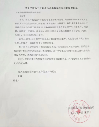 9月29日,自动化与信息工程学院收到广州保伦电子股份有限公司发来的表彰函,对我院在该企业实习的王冠岑、高烁华等7名实习同学的出色表现表示感谢。