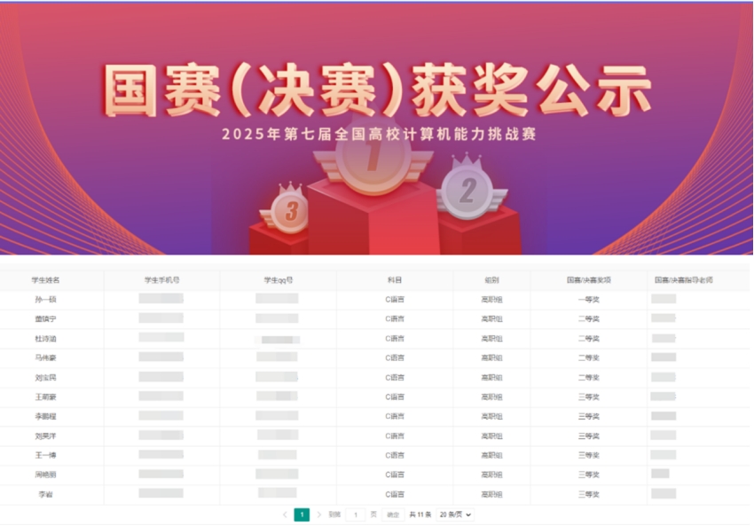 近日,第七届全国高校计算机能力挑战赛全国总决赛落幕。我校11名参赛学生沉着应战、协同发力,充分发挥专业功底与团队协作精神,最终斩获国家级一等奖1项、二等奖4项、三等奖6项的优异战绩,为学校赢得荣誉。