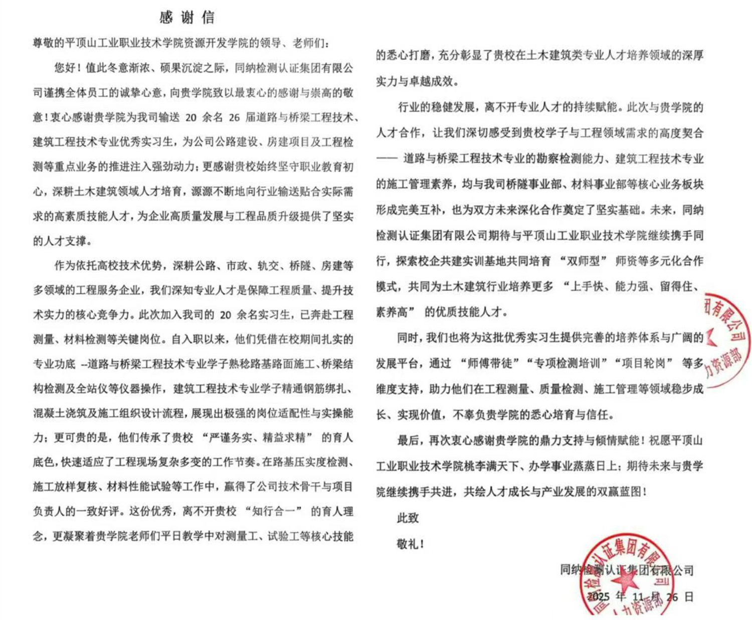 近日,资源开发学院收到来自同纳检测认证集团有限公司的一封感谢信。信中字里行间满含赞誉,对学院输送的2026届道路与桥梁工程技术、建筑工程技术专业20余名优秀实习生的出色表现给予高度认可,这也是学院近期再度凭借优质人才输出获得合作企业的书面表彰。