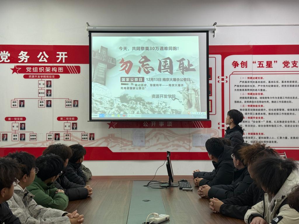 为深切缅怀南京大屠杀遇难同胞及所有惨遭日本侵略者杀戮的死难同胞,传承红色基因,厚植爱国情怀,在国家公祭日来临之际,12月13日下午,资源开发学院在党建会议室组织开展国家公祭日主题教育活动,通过主题宣讲与经典观影相结合的形式,带领学子重温民族记忆,将爱国情怀与历史敬畏内化于心、外化于行。