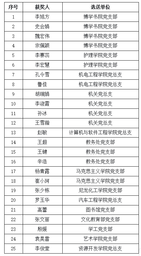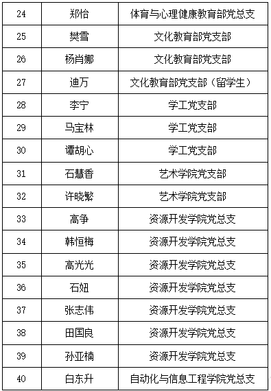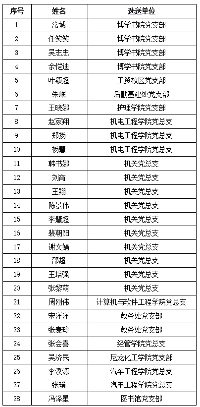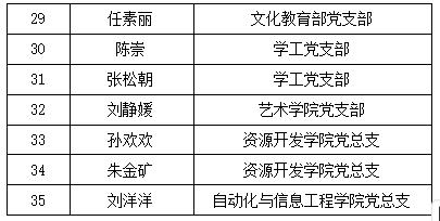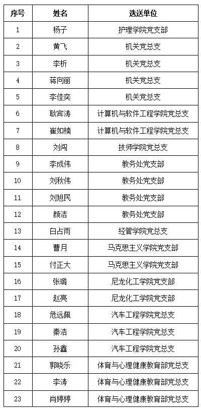 机关党总支、资源开发学院党总支、博学书院党支部、教务处党支部、学工党支部、汽车学院党总支、机电工程学院党总支、文化教育部党支部。