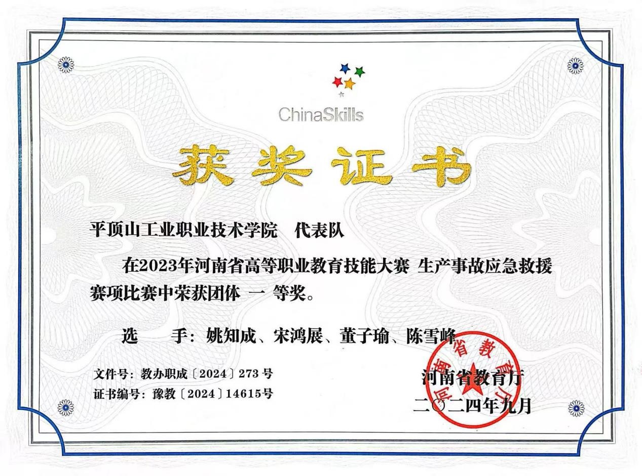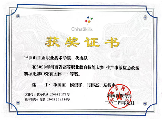 2.河南省高等职业教育技能大赛生产事故应急救援赛项比赛中荣获团体一等奖2项,2024.09