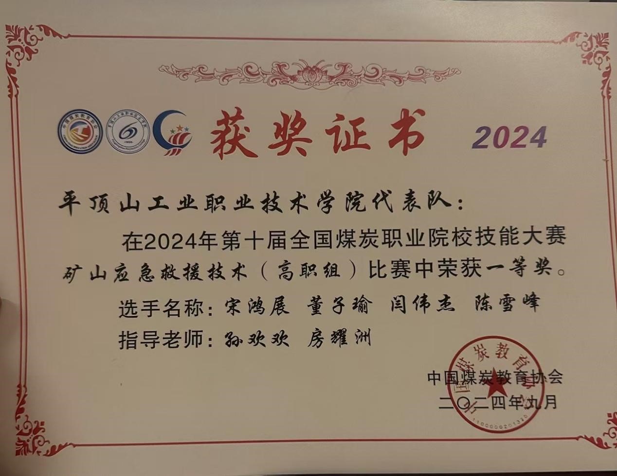 3.第十届全国煤炭职业院校技能大赛矿山应急救援技术(高职组)一等奖,2024.09