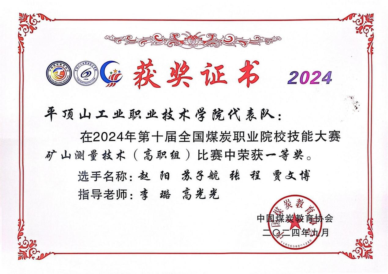 4.第十届全国煤炭职业院校技能大赛矿山测量技术(高职组)一等奖,2024.09